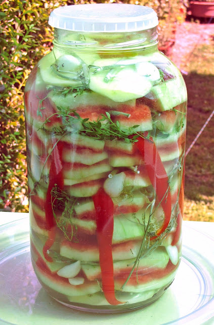 Cukkini, tök, lilahagyma, kapor, kakukkfű, csili van az üvegben. 24 óra elteltével készült kép. Ez is krumplival készült. |